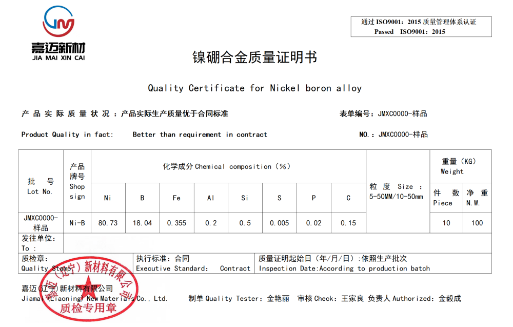 Vacuum induction melting method: High purity nickel powder and boron powder are pressed into electrodes, and then placed in a crucible with electrolytic nickel sheets in a specific order. The crucible is melted in an environment with a vacuum degree better than 1Pa, and finally filled with argon gas to protect the casting.