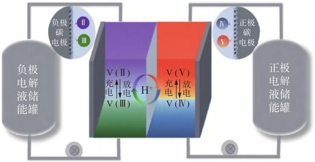 全钒氧化还原液流电池,简称钒电池(Vanadium redox battery, VRB)由澳大利亚Skyllas-Kazacos在1985年首次提出,国内中科院大连化学物理研究所从2005年开始VRB的研究。钒电池储能系统由正、负极碳电极,正、负极电解液储能罐,离子交换膜组件等构成,其示意图如图5所示。钒电池具有可瞬间充电、大功率、大容量、安全性高等优点,能解决大规模新能源发电并网需要、合理配置储能系统,满足大容量电能的存储和转换对储能电池的特殊需求。因而钒电池“当仁不让”地成为新能源储能、电网调峰、备用电源等领域的首选,被形象的称为储能“银行”。据《中国钒电池行业发展白皮书(2022年)》预计,2025年钒电池新增规模将达到2.3 GW,2030年将达到4.5 GW,当年新增市场规模约405亿元。